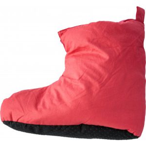 Cotton, house shoes with duck feather and down filling; the bottom inlcudes non-slip silicone dots, packed in a plastic and non-woven zipper bag with matching carry strap.