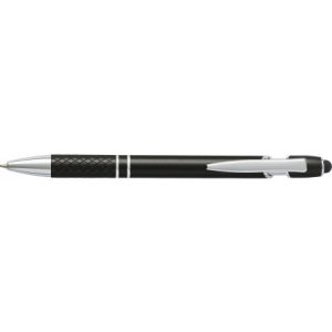Aluminium ballpen with a rubber tip suitable for capacitive screens, and metal tip, clip, and rings, blue ink.